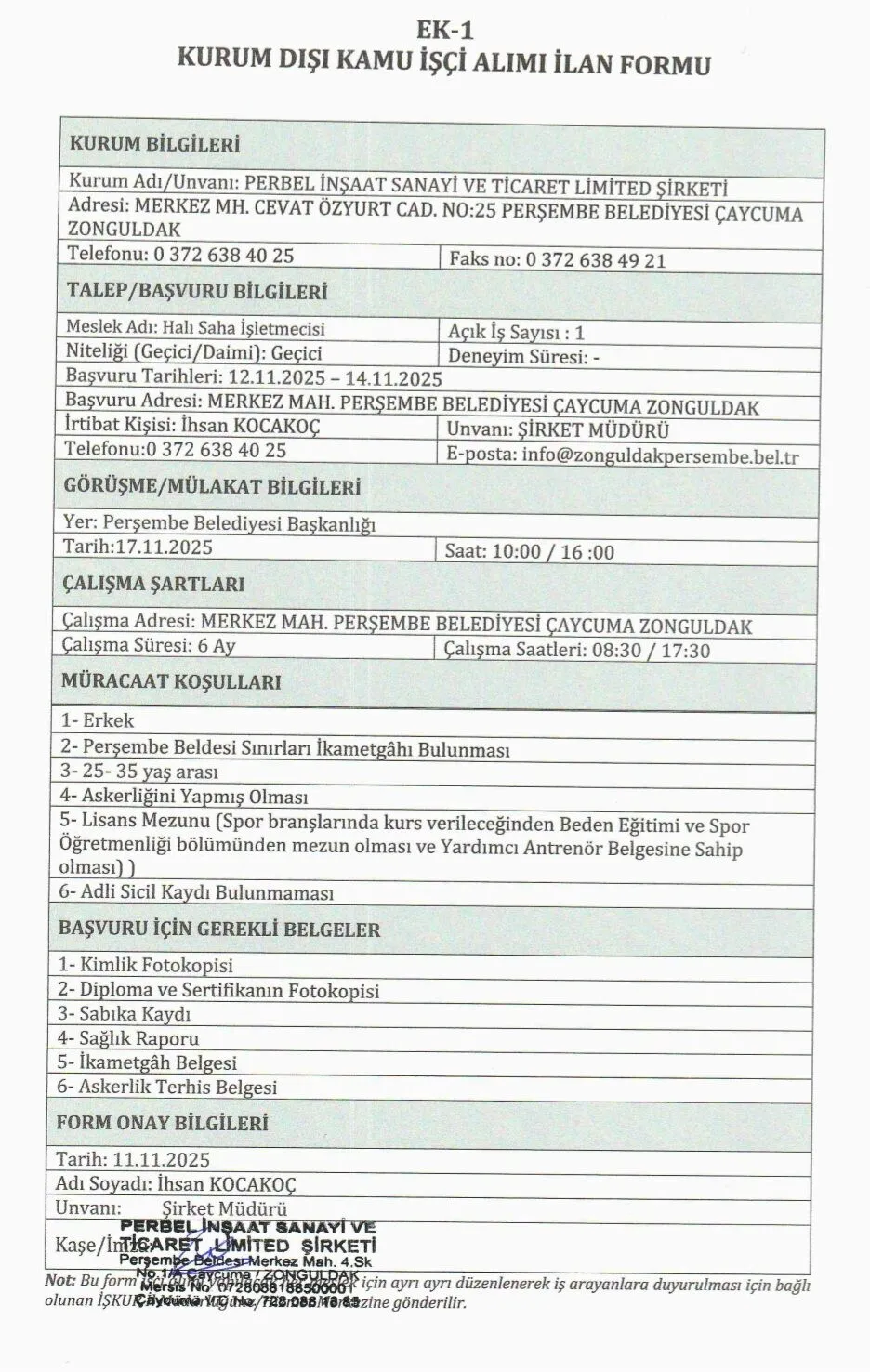 Zonguldak Sürmanşet TÜM YAZILARI Giriş: 12-11-2025 10:34 Genel +-ABONE OLPerşembe Belediyesi’ne İşkur üzerinden 1 halı saha işletmecisi alınacak. Müracaatlar 12-14 Kasım 2025 tarihleri arasında Perşembe Belediyesi’ne yapılacak.