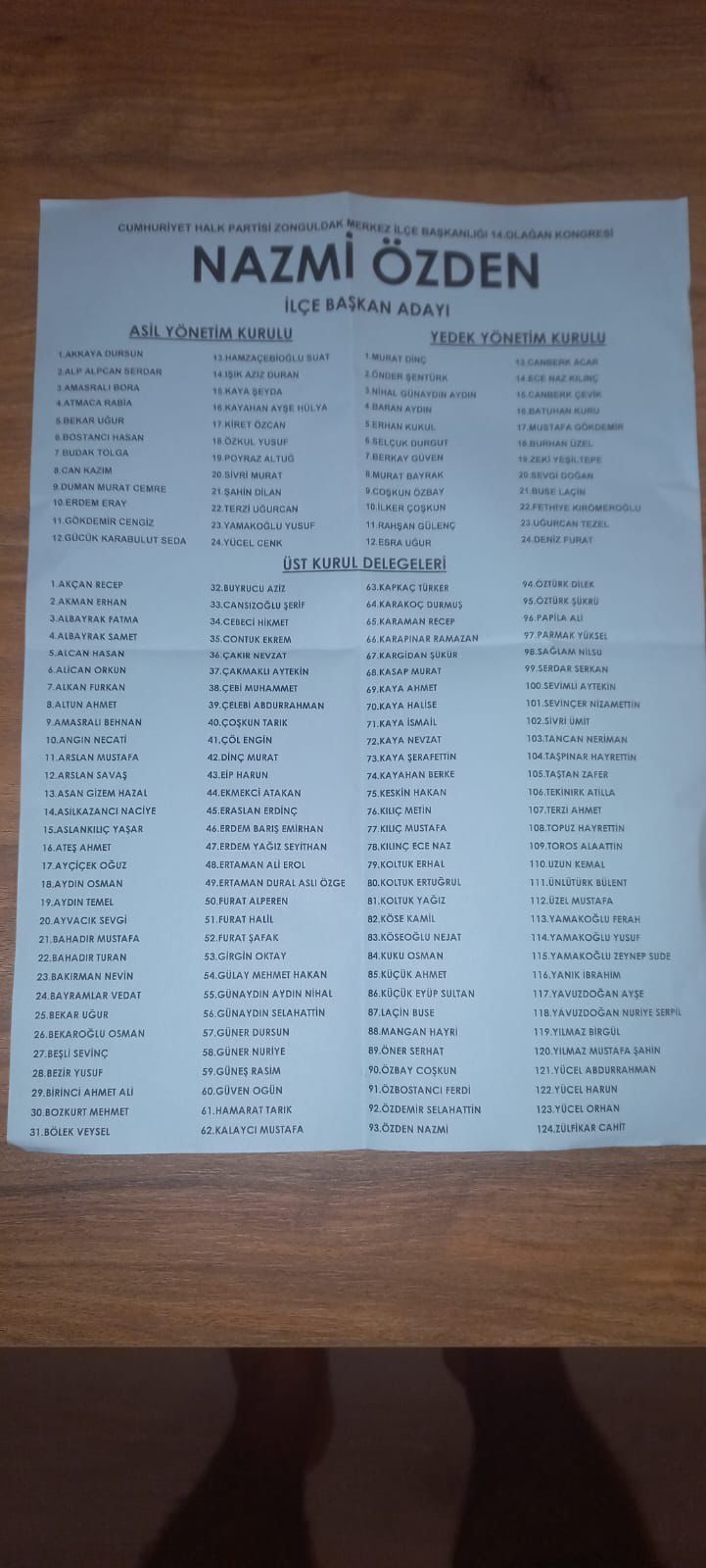 Cumhuriyet Halk Partisi 14’üncü Olağan Genel Kurulu bugün gerçekleştirildi. Nazmi Özden’in Tek aday olarak girdiği seçimde yönetim kurulu listesi belli oldu. Özden’in listesi şu şekilde;”