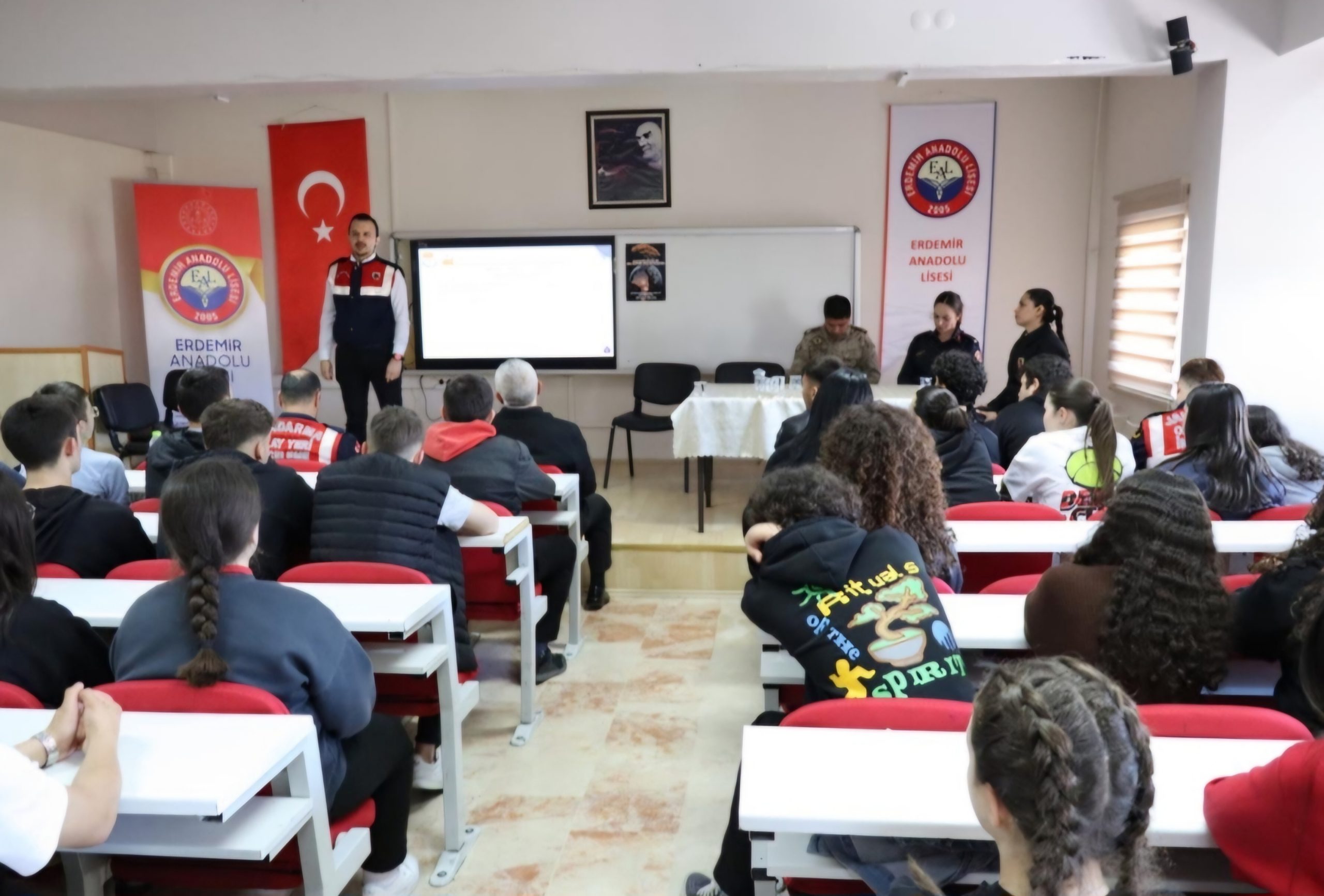 Zonguldak Erdemir Anadolu Lisesi son sınıf öğrencileri, 16 Nisan 2024 Salı günü “Meslek Tanıtım” faaliyetleri kapsamında Jandarma mesleğini yakından tanıma fırsatı buldu. Zonguldak İl Jandarma Komutanlığı’nın farklı birimlerinden görevli farklı rütbedeki personeller, öğrencilere Jandarmanın emniyet ve asayiş görevleri, faaliyet alanları, vizyon ve misyonu hakkında detaylı bilgi verdi. Ayrıca, Jandarma ve Sahil Güvenlik Akademisi’ne öğrenci alım şartları ile Jandarmanın ihtiyaç duyduğu üstün nitelikli Subay, Astsubay ve diğer personellerin yetiştirilme süreci konularında öğrencilerin sorularını cevapladı.