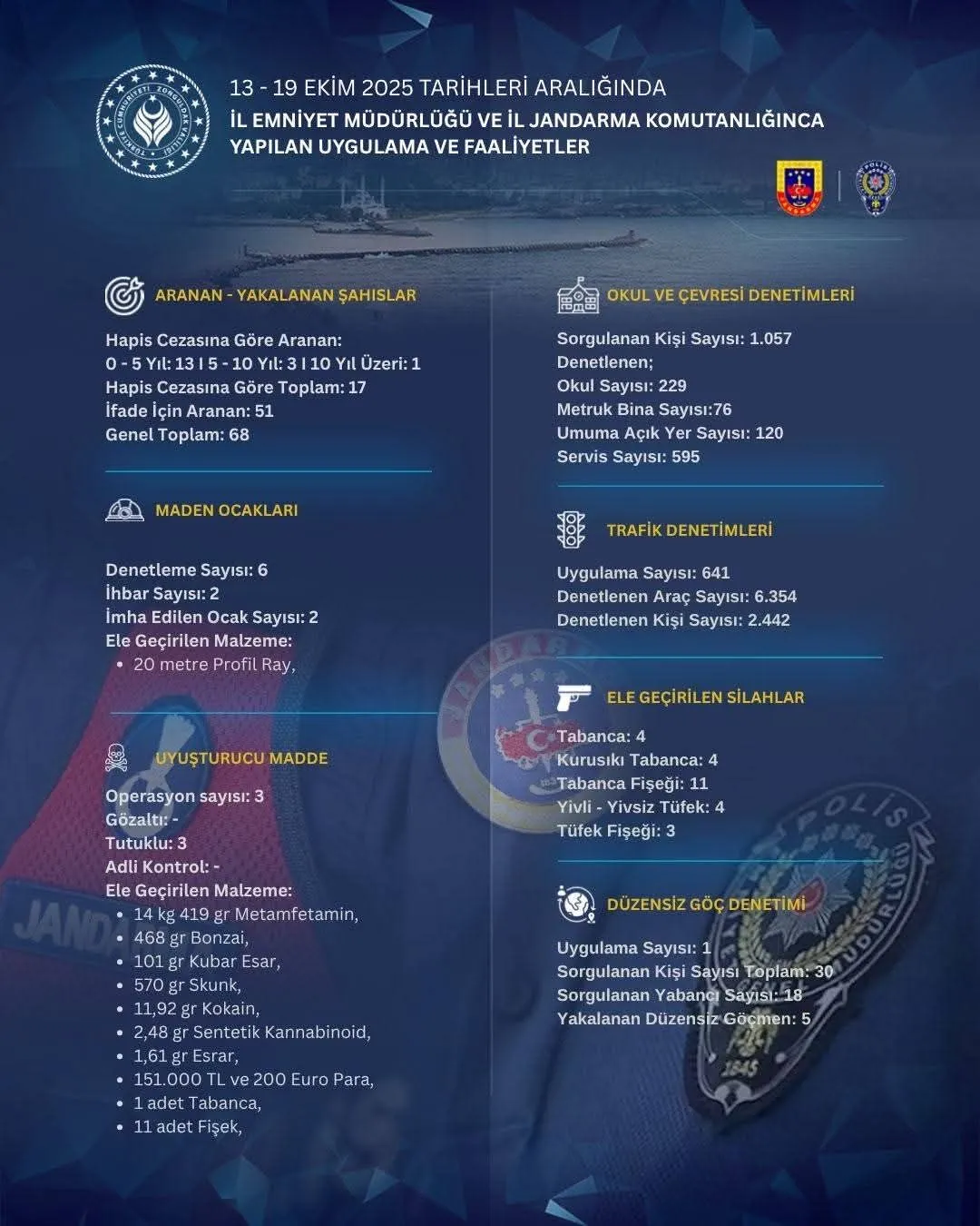 Zonguldak’ta, 13 – 19 Ekim 2025 tarihleri arasında, İl Emniyet Müdürlüğü ve İl Jandarma Komutanlığınca, vatandaşların huzur ve güvenliği için gerçekleştirilen uygulama ve faaliyetler paylaşıldı.